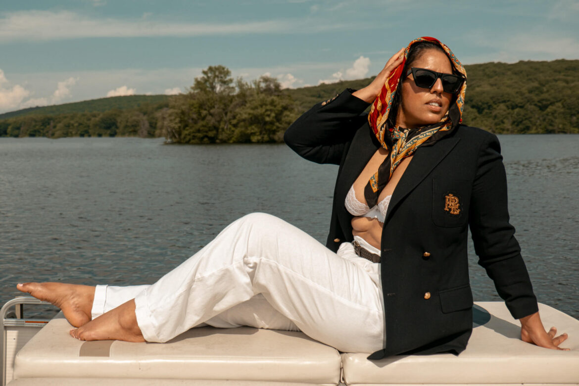 Yanis wanted to create a vintage look on a yacht with her extensive collection of designer pieces. We settled on a pontoon boat + her vintage Ralph Lauren blazer + silk Burberry scarf for this vogue-esque session! I loved every second of this shoot in North Jersey + cannot wait for my next session with Yanis!
